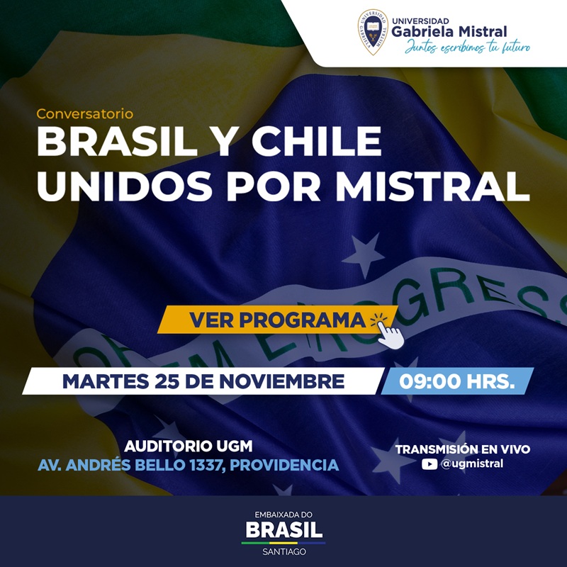 Este martes 25 de noviembre invitamos al evento académico "Brasil y Chile unidos por Mistral", especialmente destinado a la comunidad UGM a participar de una instancia de encuentro cultural, académico y comercial entre ambos países, junto a la colaboración de la embajada de Brasil en Chile.