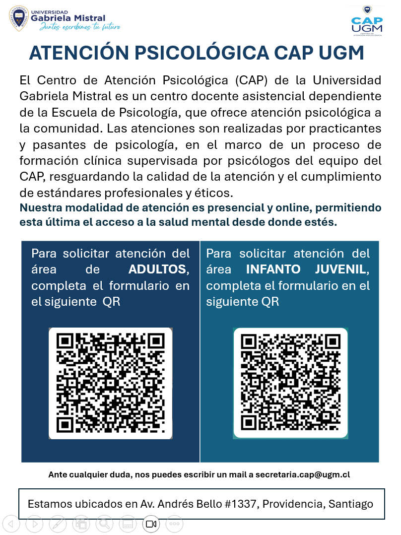 El Centro de Atención Psicológica dependiente de la Universidad Gabriela Mistral, es un centro asistencial docente. Su propósito es aportar a la Salud Mental en dos ejes. El primero y más importante, dando formación práctica a los psicólogos que inician su ejercicio profesional en la psicología clínica, en un espacio supervisado por profesionales de amplia trayectoria clínica. Y, en segundo lugar, realizando acciones de prevención, promoción, acompañamiento y atención psicológica para público infanto-juvenil y adultos, dentro y fuera de la comunidad UGM.