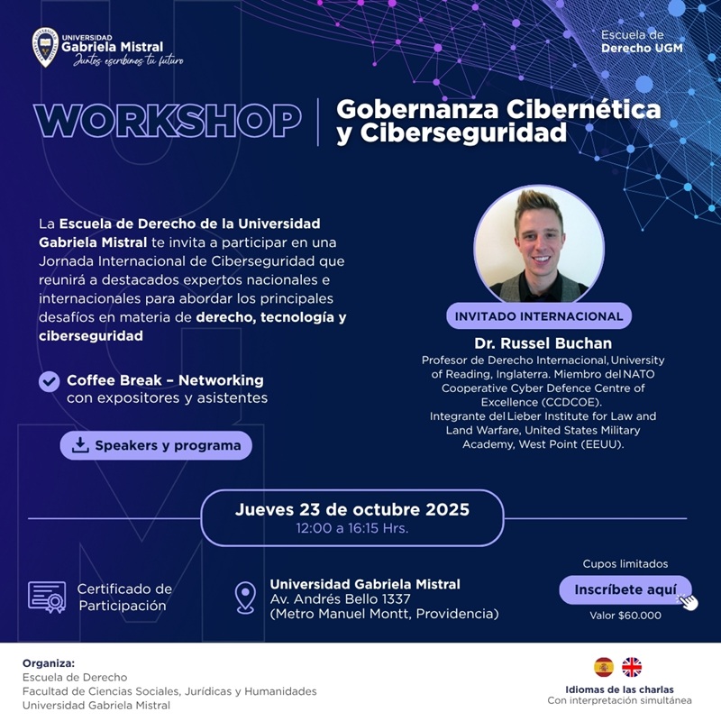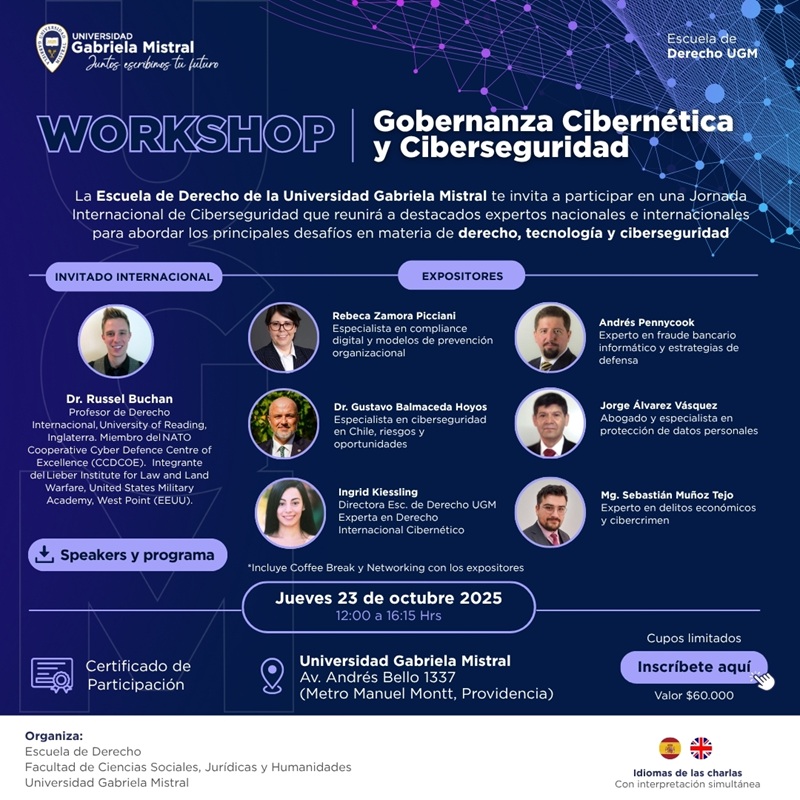 La Escuela de Derecho de la Universidad Gabriela Mistral tiene el agrado de invitar al workshop internacional "Gobernanza Cibernética y Ciberseguridad".
