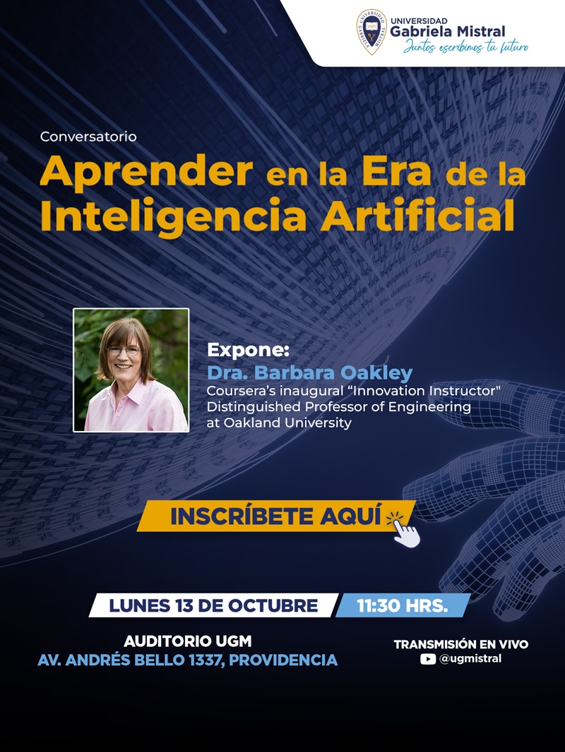 La Dra. Bárbara Oakley, Innovation Instructor de Coursera e investigadora de la Oakland University, referente mundial en neurociencia del aprendizaje y autora de exitosos programas sobre habilidades cognitivas, visitó la Universidad Gabriela Mistral (UGM) y dictó la conferencia "Aprender en la Era de la Inteligencia Artificial.