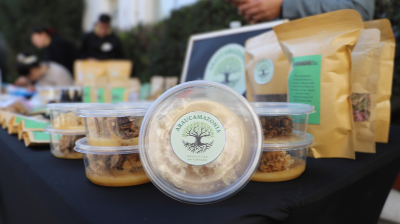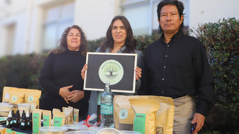 Desde la ciudad de Temuco también llegó AraucAmazonia, un emprendimiento liderado por Fragilia Huenulao, estudiante Advance de Psicología, quien junto a su hermana Edith Huenulao y su socio Pompilio Azang, presentó una línea de productos naturales y superalimentos que fusionan la cultura mapuche con la peruana.