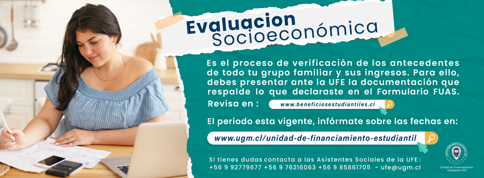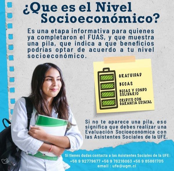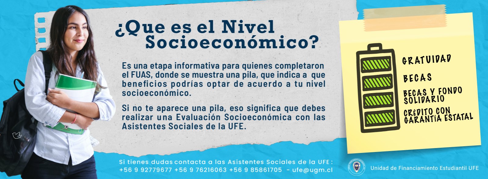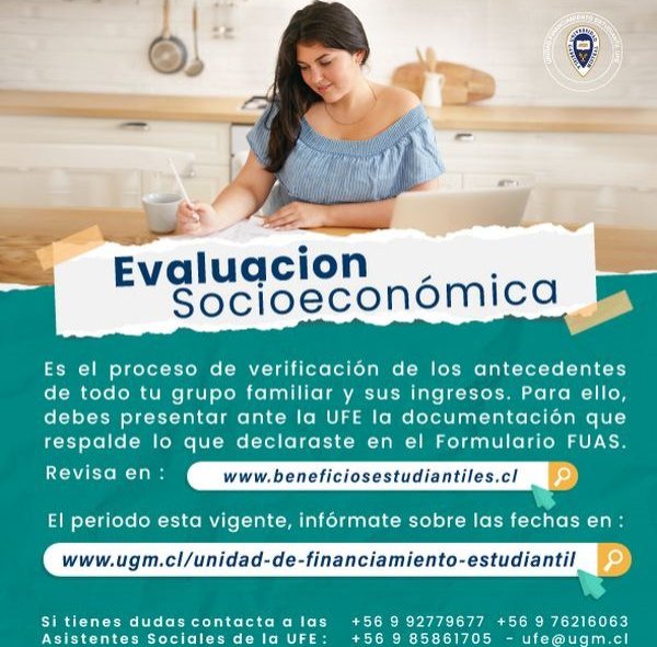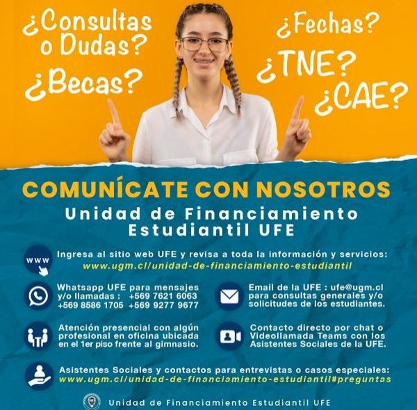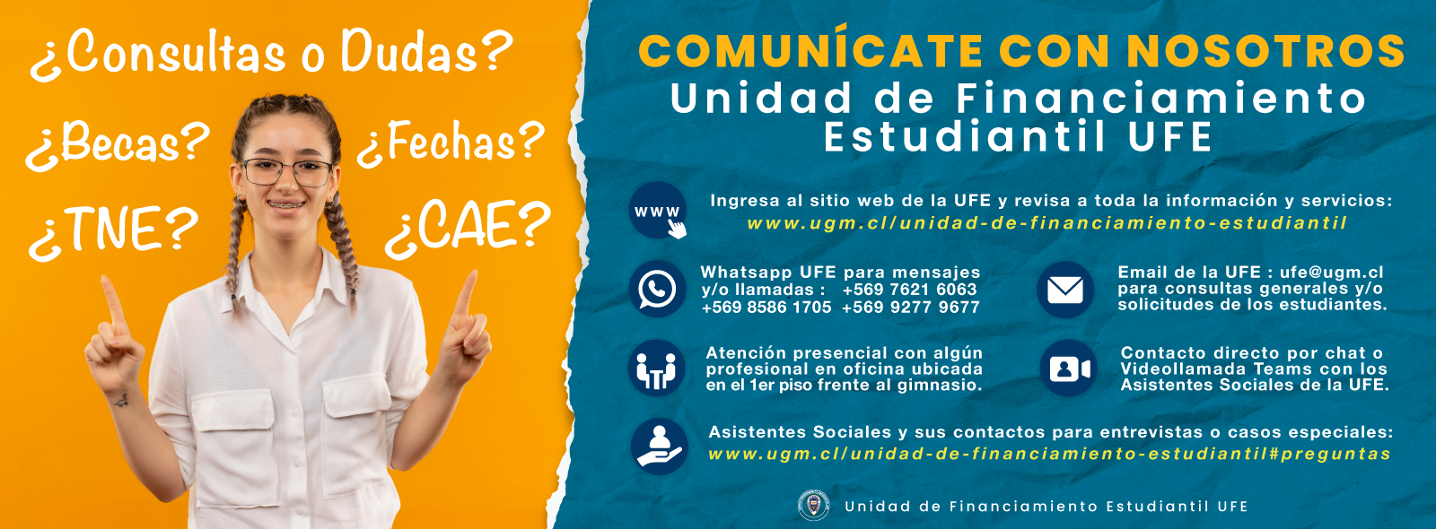 La UFE cuenta con un Equipo de Asistentes Sociales por Escuelas que ofrecen una atención personalizada al estudiante a través de: orientación, evaluación socioeconómica, seguimiento, retención, derivación, administración y supervisión de los procesos para la entrega de beneficios determinados por Mineduc, Ingresa, JUNAEB, TNE Nacional y becas internas UGM, que sean un apoyo concreto y efectivo para que el alumno pueda terminar sus estudios.
