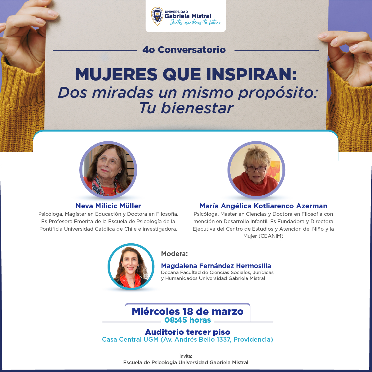 Este miércoles 18 de marzo, la Escuela de Psicología de la Universidad Gabriela Mistral invita a participar del cuarto conversatorio Mujeres que inspiran, una actividad abierta a toda la comunidad universitaria que contará con la participación de dos destacadas expositoras.