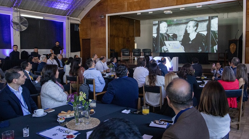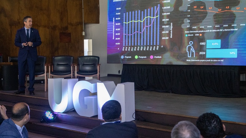 En la apertura del encuentro, el Rector Sergio Mena relató los principales hitos de la UGM, la actualización del proyecto institucional, las iniciativas académicas y los proyectos propios en los cuales están trabajando alumnos y académicos con la utilización creativa y ética de la IA; y los desafíos de la reconfiguración profesional y la irrupción de la Inteligencia Artificial, entre otros temas.
